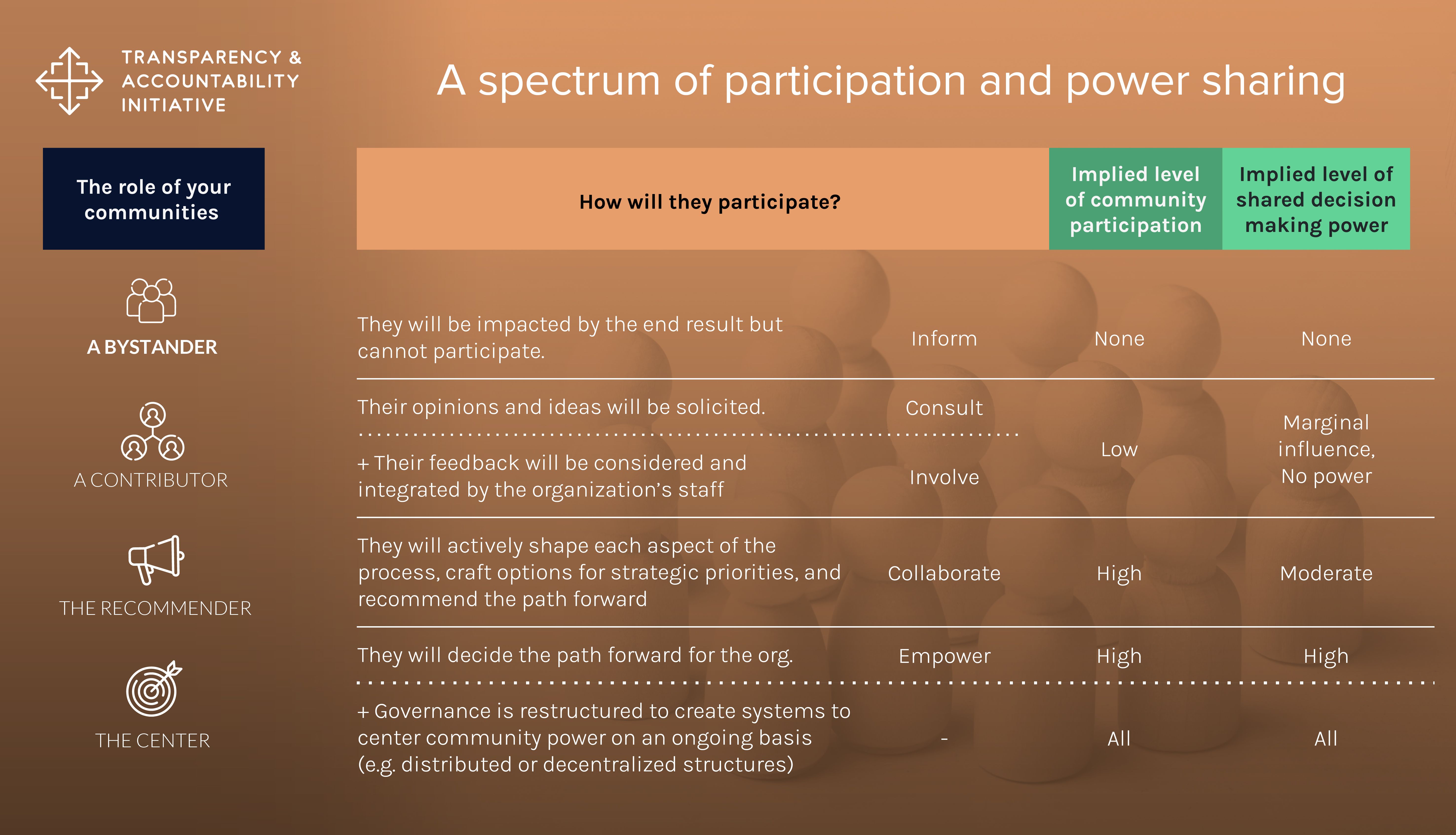To learn more about how to approach participatory strategy, visit the Transparency and Accountability Initiative’s Library on Participatory Strategy.