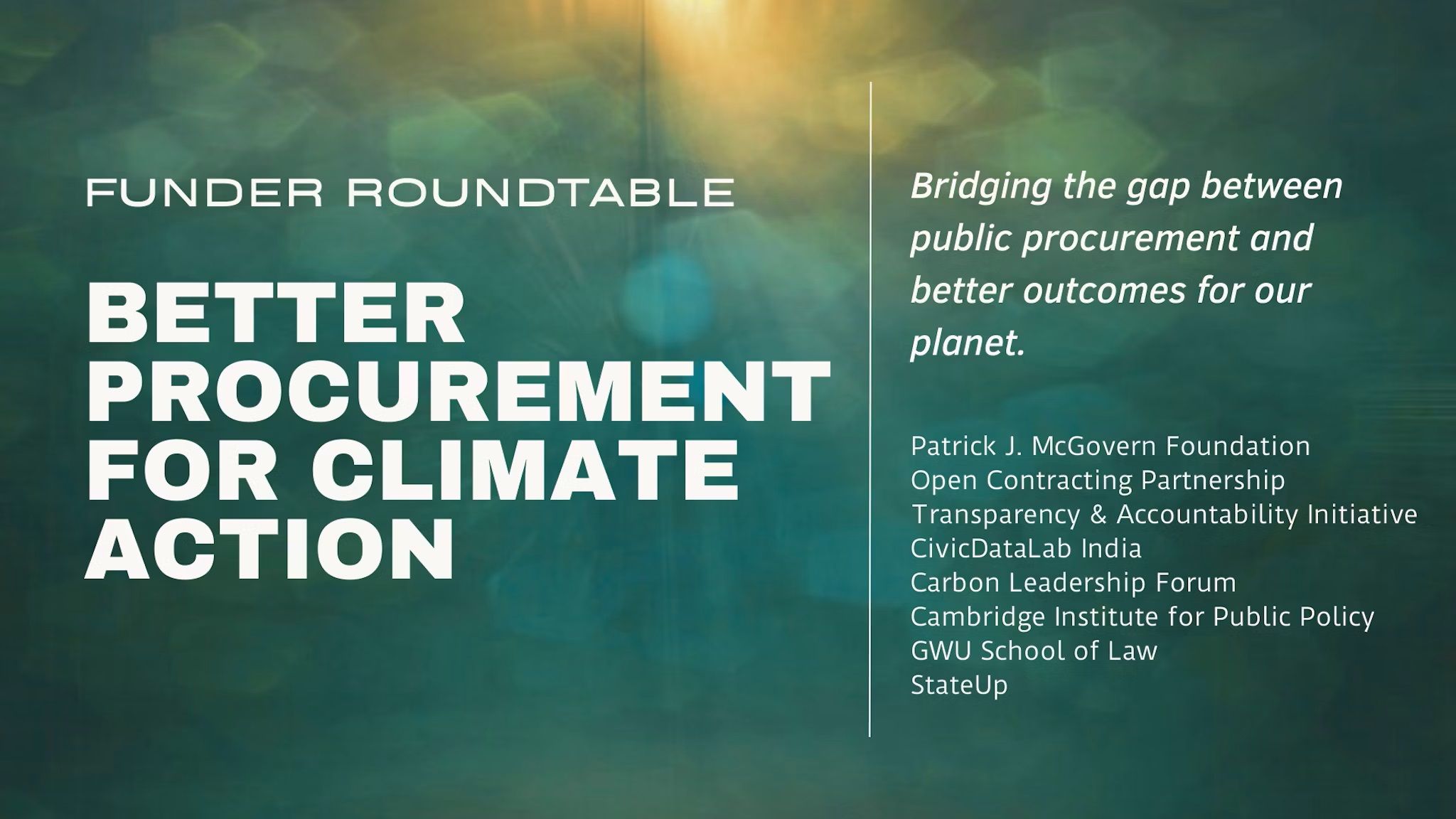 Last month, we gathered with over 60 climate action reformers to dive deeper into the role of public procurement in fighting climate change and building resilience. We were joined by co-organizers at the Patrick J McGovern Foundation and The Transparency & Accountability Initiative, as well as speakers from CivicDataLab, Carbon Leadership Forum, George Washington University School of Law, Cambridge University, and StateUp.