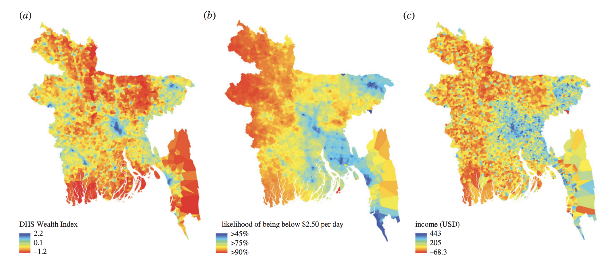 High-resolution poverty maps for Bangladesh, developed by CEGA affiliate Josh Blumenstock and co-authors. Here, welfare indicators are predicted using a combination of mobile call detail records, satellite imagery, and survey data. Credit: Steele et al (2017) J R Soc Interface 14: 20160690.