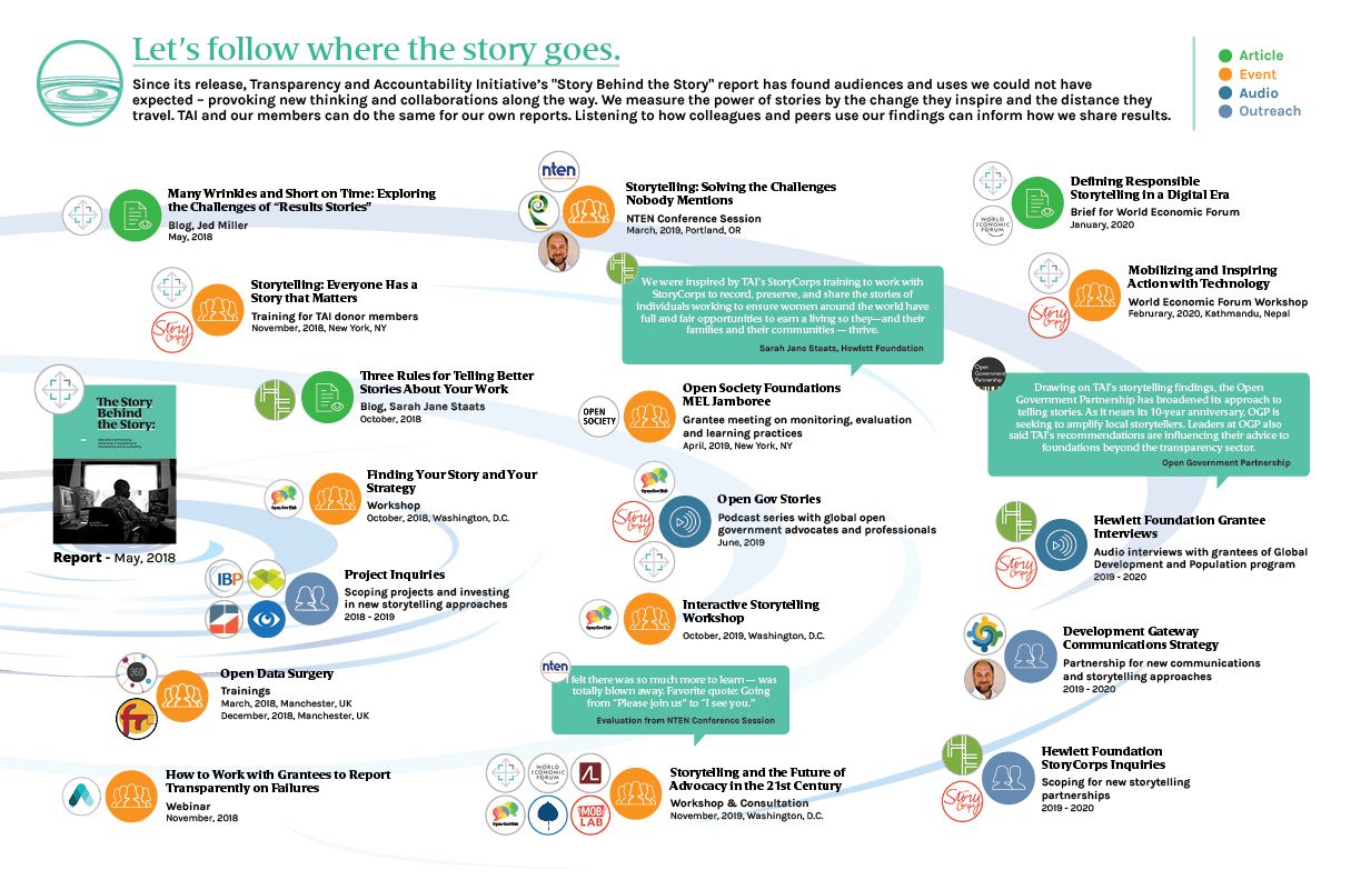 We measure the power of stories by the change they inspire and the distance they travel. TAI and our members can do the same for our own reports. Listening to how colleagues and peers use our findings can inform how we share results. Investing more in tracking where and how knowledge flows should help us target future knowledge generation and dissemination. Another report or blog in 2020 is not our metric for success. Being able to track how insights influenced others is.