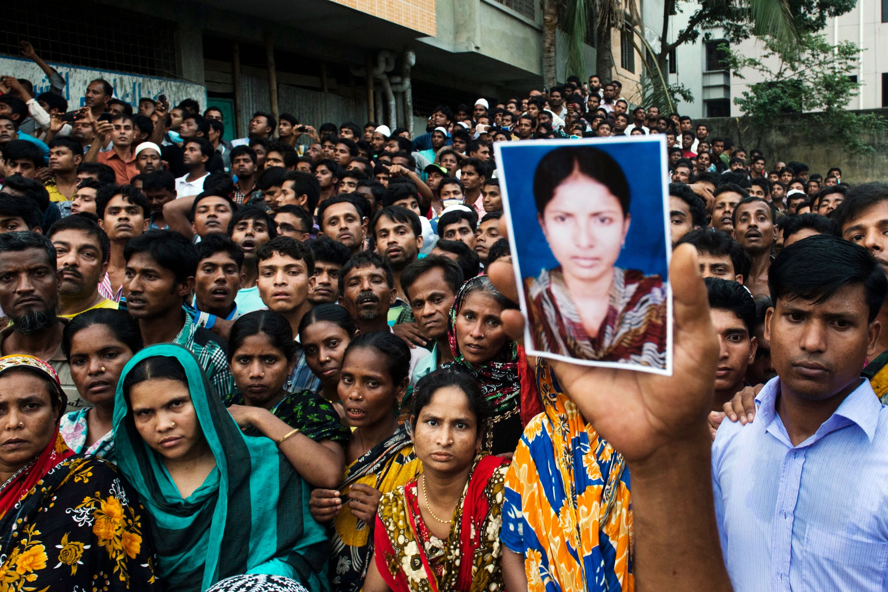 Figure 2 Relatives of missing workers in the Rana Plaza garment factory building that collapsed hold pictures of their family members in Savar, near Dhaka, Bangladesh. © Ismail Ferdous, 2013