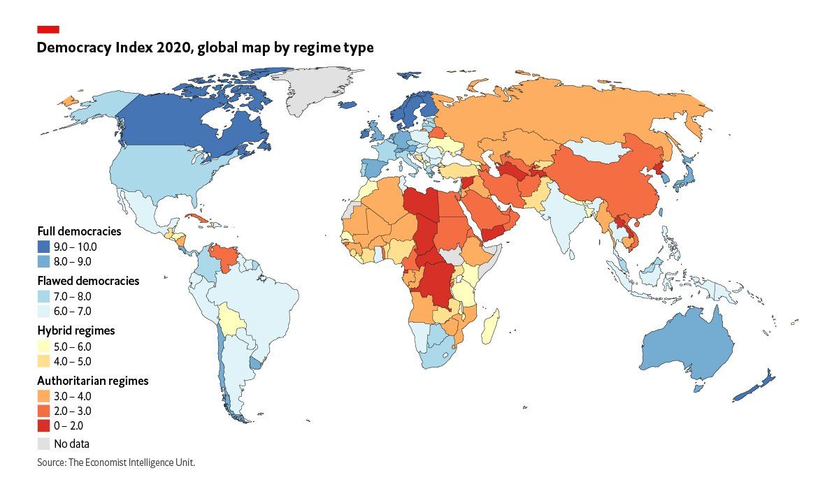 Last week we covered the latest Corruption Perceptions Index and Trust Barometer. This week, we kick off with the Economist Democracy Index. The results aren’t pretty – just 8.4% of the world’s population live in a “full democracy” while more than a third live under authoritarian rule. Norway tops the list.